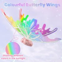 - Gorgeous Colorful & Adjustable Shoulder Strap This electric fairy wings for kids girls is made of custom laser film, the reflection of different scenes will change color with magical gradient effect, lightweight and not easy to age and fade, these butterfly shaped wings are the perfect addition to women’s fairy costumes. This electric flapping fairy wings has an adjustable shoulder strap design that can be worn by both adults and children.