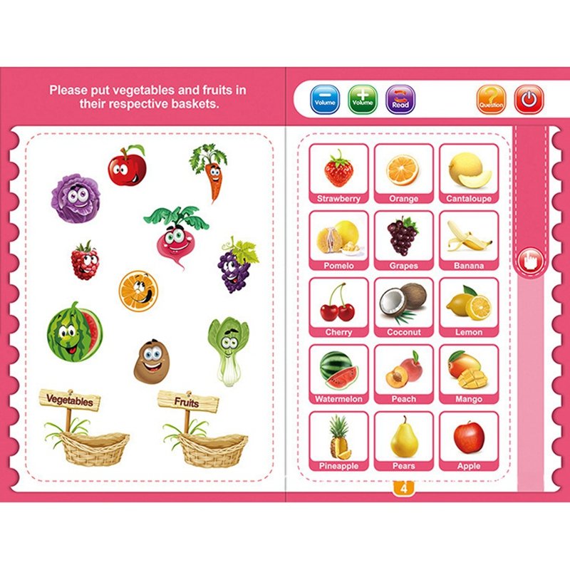 Phonetic Learning book has multiple modes to help children learn alphabets and spellings. Every page has button please press the switch first to start the page. As a child presses the image on the book, the sound of the alphabet, the word and spelling are played.