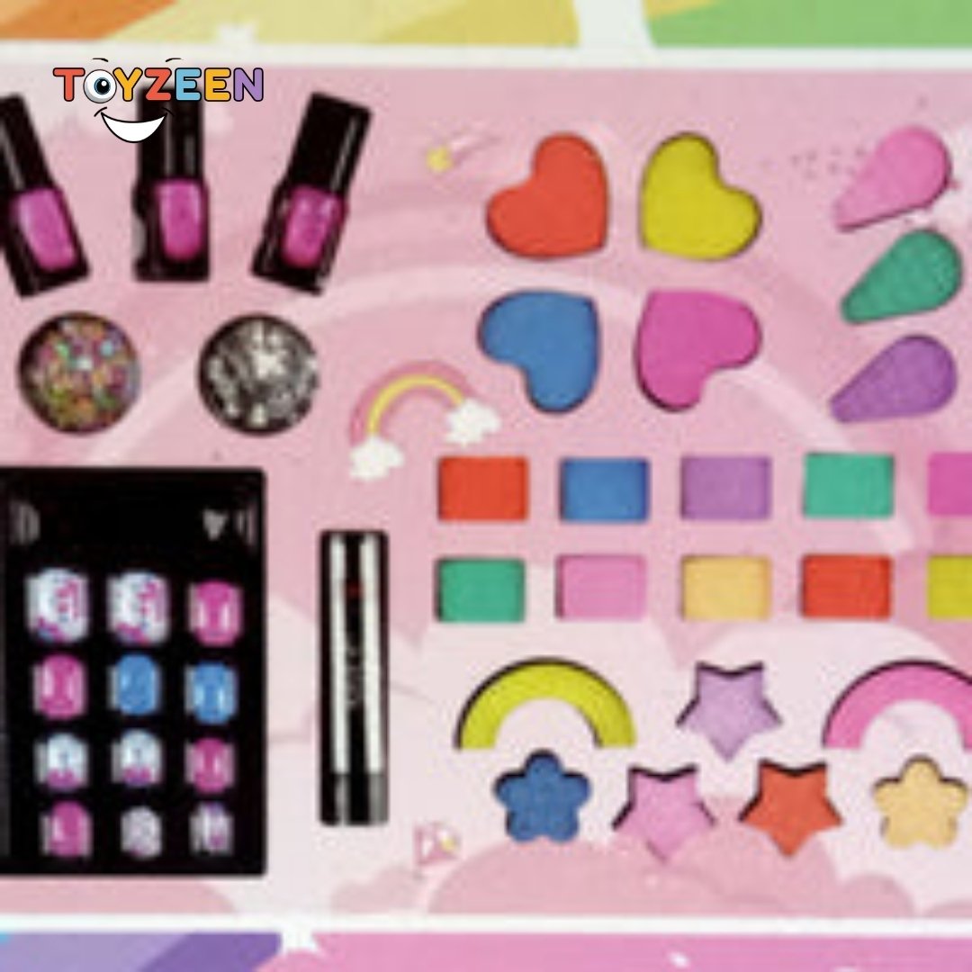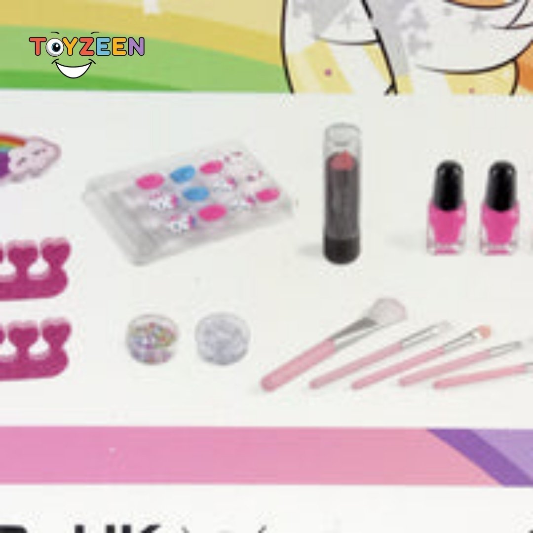 Look at the different items: lip stick, nail polish, and brushes. Each item is likely to have vibrant colors and fun designs.